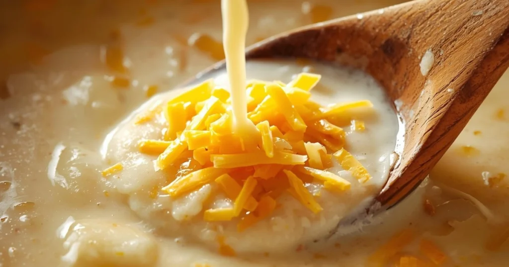 Stir in milk or heavy cream along with shredded cheese. Season the soup with salt and pepper to suit your taste.