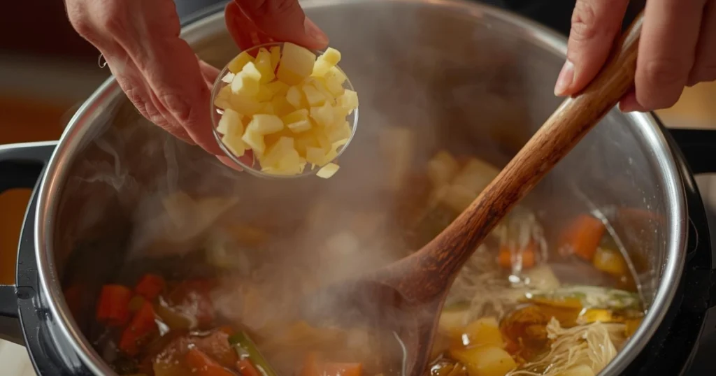 Add chopped potatoes to the pot, then pour in the chicken or vegetable broth. Bring to a simmer and cook until the potatoes are tender (approximately 10β15 minutes).